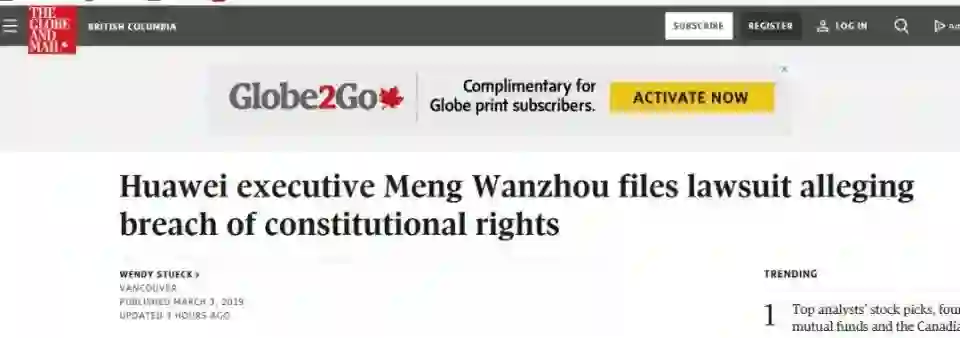 《环球邮报》称,孟晚舟的律师团队周日(3日)发出一份声明,称已于3月1日向加拿大不列颠哥伦比亚省高等法院提起民事诉讼。声明说,诉讼指控孟女士被严重侵犯宪法权利,并就“加拿大政府官员多次未能遵守法治而造成的公职失职和非法监禁”要求赔偿。