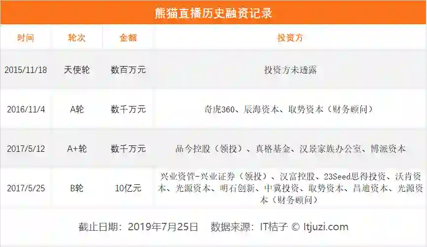 其中烧钱大户——「熊猫直播」近期也在唏嘘中结束了运营。IT 桔子显示,「熊猫直播」至结束运营共计获得 4 轮融资,投资方不乏真格基金等知名机构。