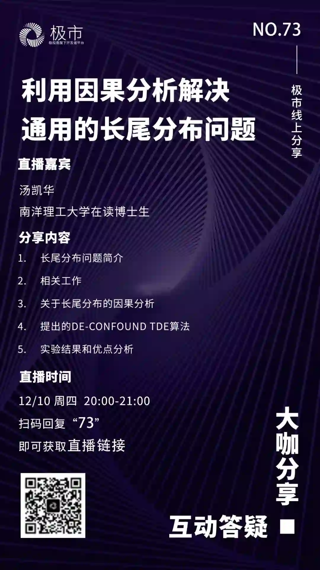 本次分享,我们邀请到了来自南洋理工大学的汤凯华博士,为我们分享他团队NeurIPS 2020的论文“Long-TailedClassification by Keeping the Good and Removing the Bad Momentum Causal Effect”。该工作利用因果分析技术,首次实现不需要提前预知数据分布情况下适用的长尾分布去偏见算法。并且该方法不增加任何额外的训练负担,可以轻易适用于各种场景,如我们在图片分类,物体检测,实例分割任务上都取得了显著提升。