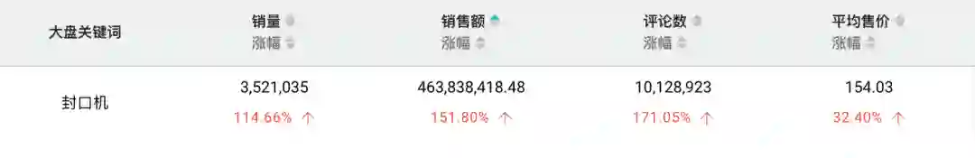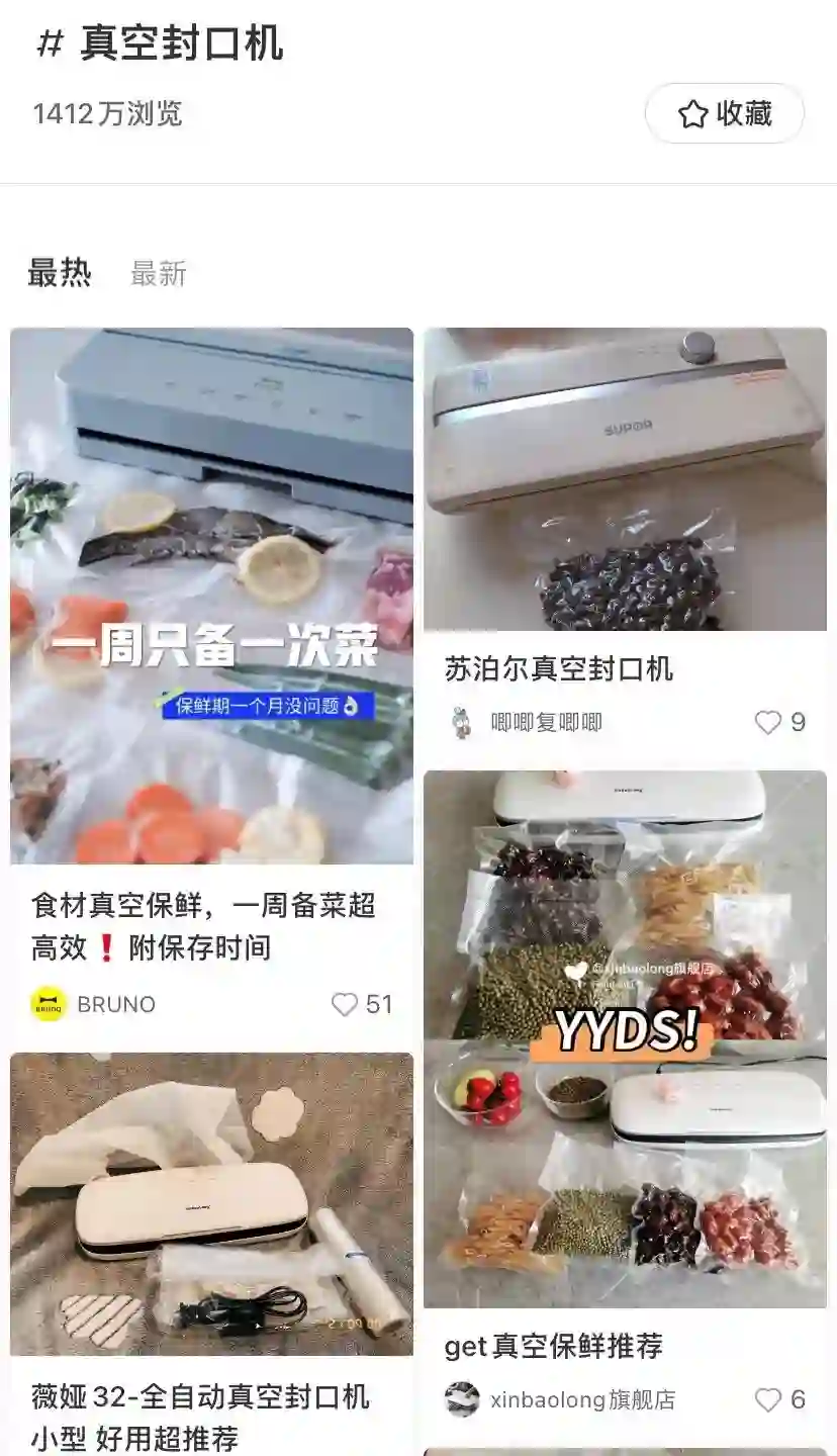 在小红书上,#真空封口机#话题的浏览量达1412万,多篇相关笔记都提到疫情下的囤货需求,或时新的上班族「一周备菜」计划。店怪兽大盘数据也显示,封口机近30日的销量和销售额同比均有翻倍增长。