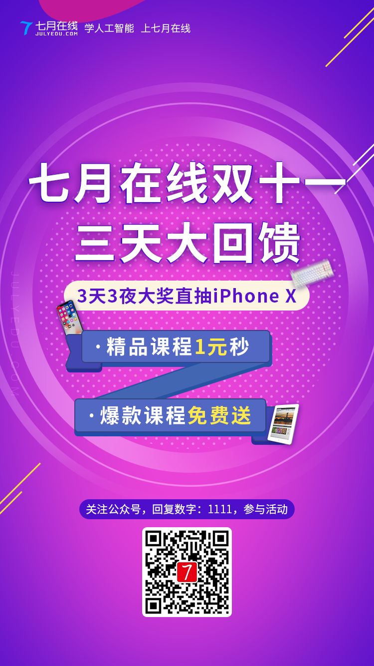 ps:关注服务号:七月在线,回复数字:1111,邀请好友增加抽奖机会喔~