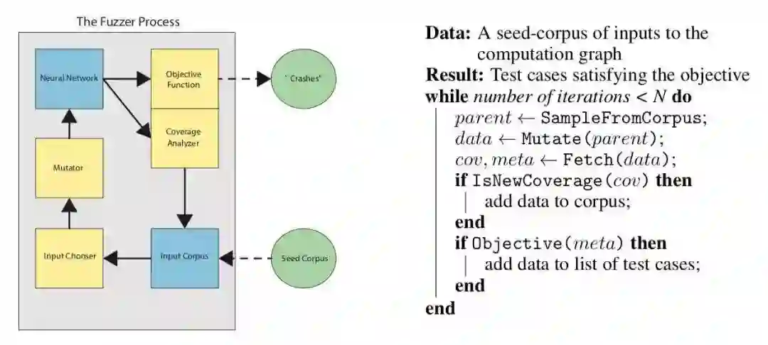 fuzzing 主循环的粗略描述。左:fuzzing 过程的数据流图。右:fuzzing 主循环的算法描述。