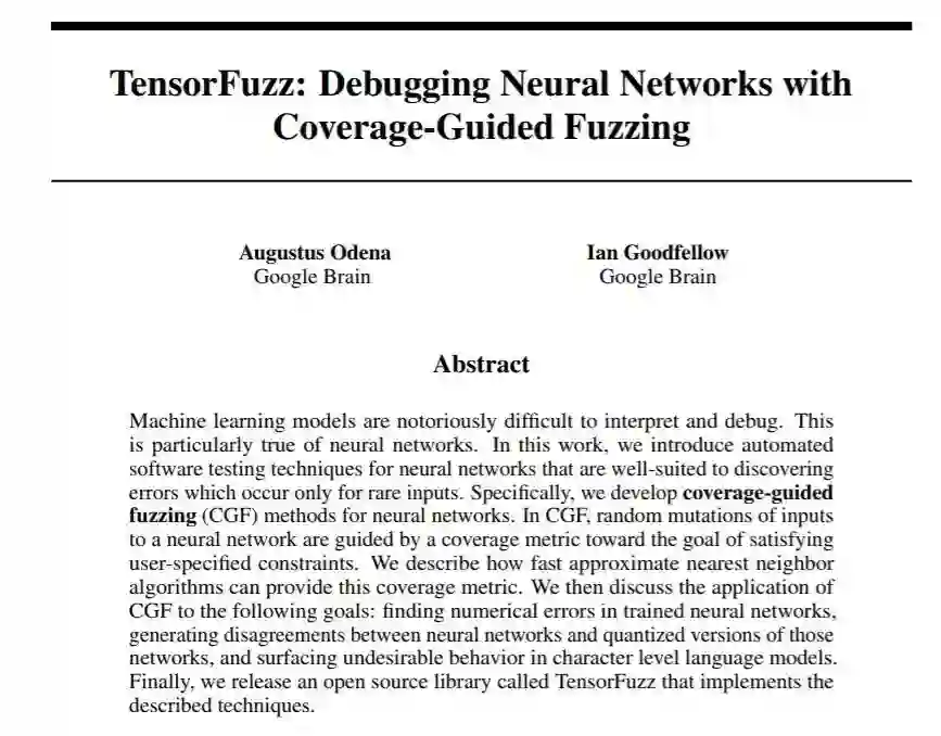谷歌大脑团队为神经网络引入了覆盖引导模糊的概念,并描述了如何在此背景下构建有用的覆盖率检查器。他们通过查找数值误差、神经网络与其量化版本之间的分歧,以及揭示 RNN 的不良行为,证明了 TensorFuzz 的实用性。他们发布了 TensorFuzz 库,让其他人可以基于现有的工作继续研究,或使用模糊器来找出真正的问题。