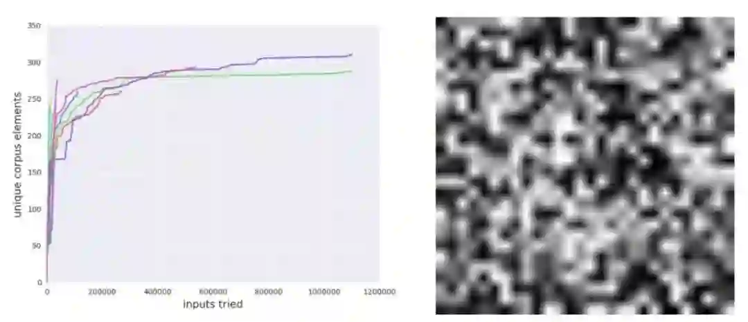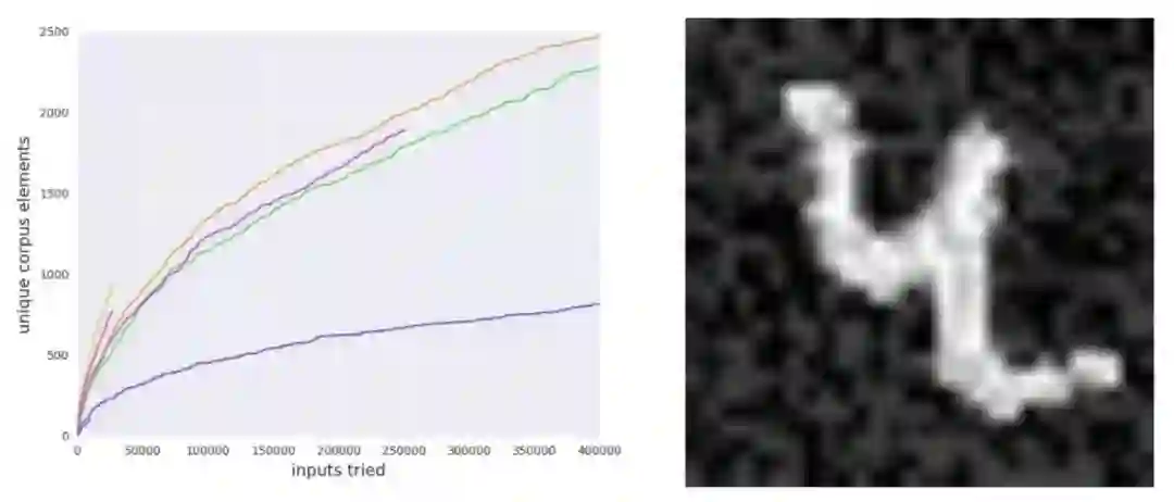 他们用一些不安全的数值运算训练了一个 MNIST 分类器,然后对来自 MNIST 数据集的随机种子运行 10 次模糊测试。模糊器每次运行都发现了一个非限定元素。左图:运行时模糊器的累计语料库大小,运行 10 次。右图:模糊器找到的图像示例。
