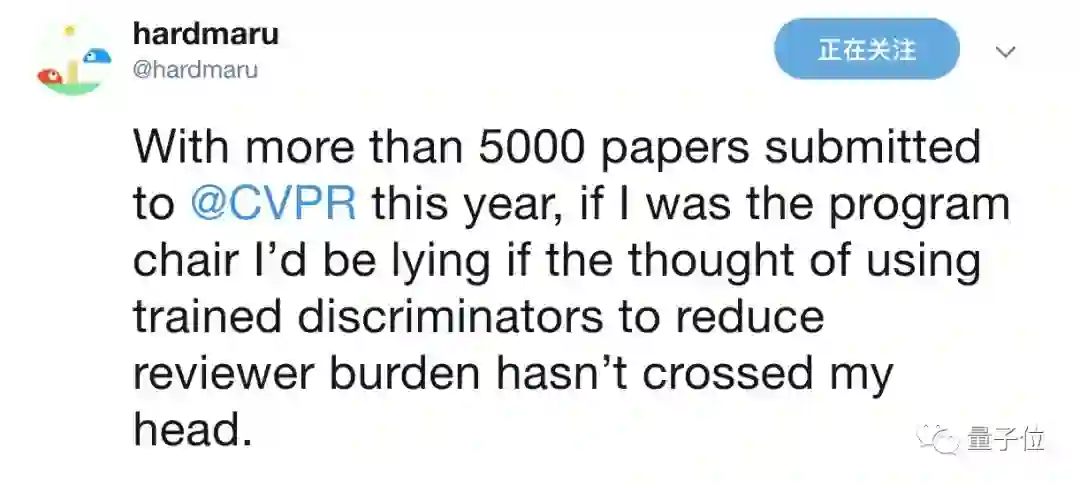 今年CVPR就收到了5000多篇投稿,如果我是程序主席,要说没想过训练个鉴别器减轻评审工作量那肯定是在说谎。