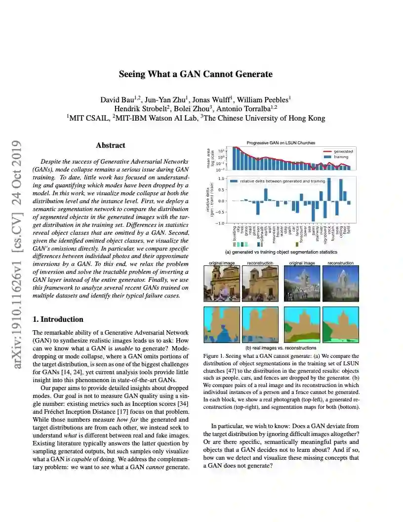【导读】生成对抗网络模型(GAN),是深度学习生成模型中,影响力非常大的模型了。无论是学术界还是工业界,GAN都在各种任务中大放异彩。但是,模式崩塌仍然是GAN训练过程中的一个严重问题。显然,GAN在训练过程中,是有选择的学习了某些模式,同时又放弃了某些模式的。但是到底GAN放弃了什么模式呢?GAN这个模型,不能生成哪些东西呢?来自MIT的David Bau等人,在ICCV 2019 上的文章《Seeing What a GAN Cannot Generate》,进行了一系列实验,尝试找到问题的答案。