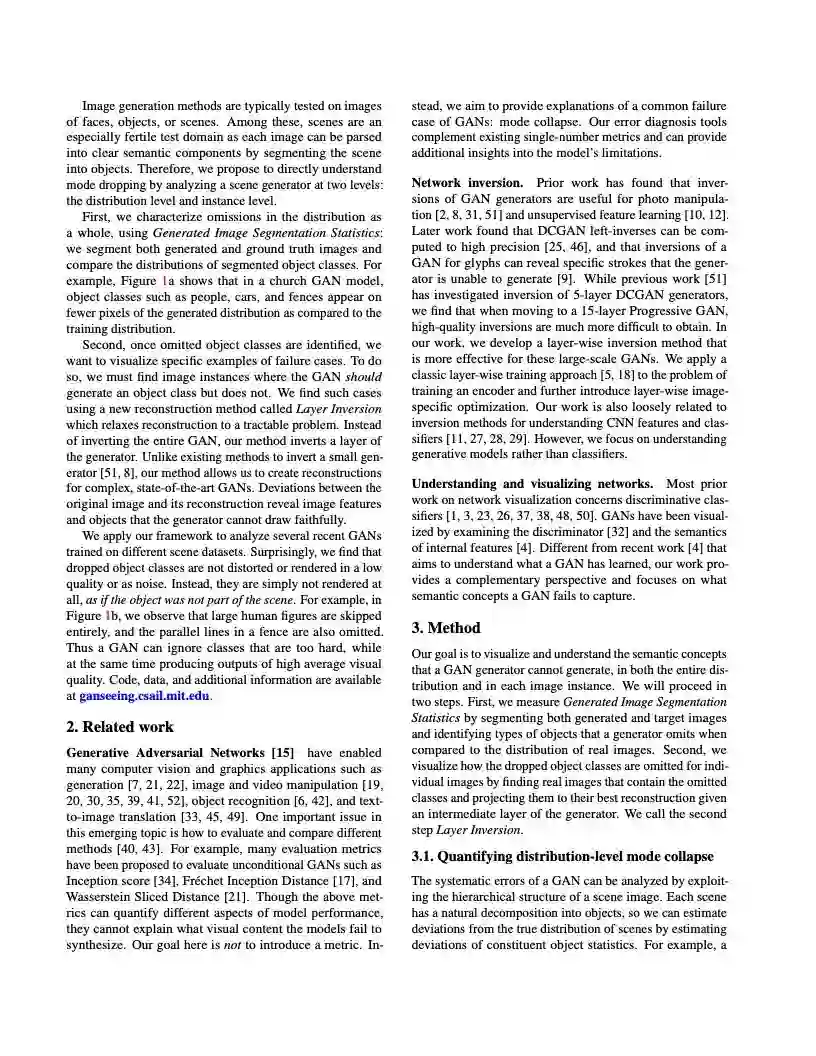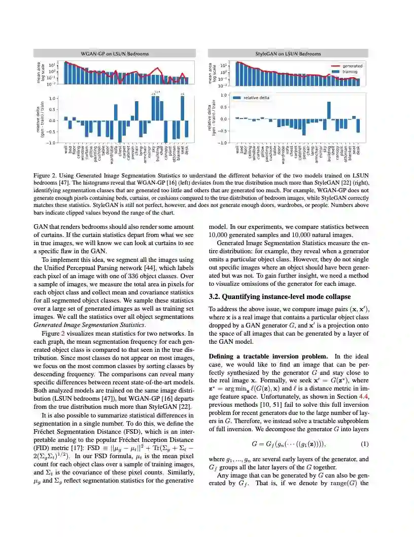 尽管生成对抗网络(GANs)取得了成功,但模式崩溃仍然是GAN训练中的一个严重问题。到目前为止,很少有工作关注于理解和量化GANs模型放弃了哪些模式。在这项工作中,我们在分布层和实例层可视化模式崩溃。首先,我们部署了一个语义分割网络来比较分割后的目标在生成的图像中的分布和训练集中的目标分布。统计上的差异揭示了被GAN省略的对象类。其次,给出被识别的被省略的对象类,我们可以直接可视化被GAN省略的信息。特别地,我们比较了个别照片与GAN近似反演照片之间的具体差异。为此,我们放宽了反演问题,解决了反演GAN层而不是整个发生器的易处理问题。最后,我们使用这个框架来分析最近在多个数据集上训练的几个GANs,并识别它们的典型故障情况。