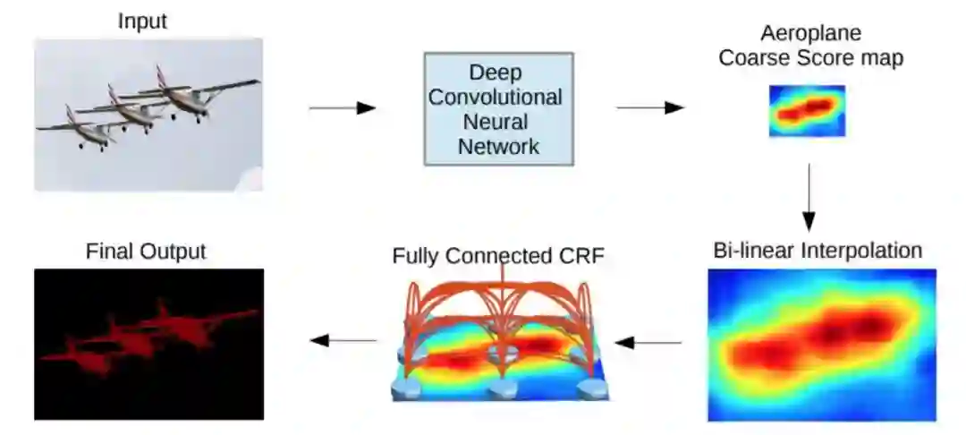 Chen等人[38]提出了一种基于CNNs与全连通CRFs结合的语义分割算法(图9)。他们发现,来自深层CNNs的最后一层的响应并没有足够的本地化以进行精确的对象分割(这是由于CNNs的不变性使其适合于分类等高级任务)。为了克服深度CNNs定位性能差的问题,他们将最后一层的响应与全连接的CRF相结合。他们证明了他们的模型能够以比以前方法更高的准确率定位线段边界。