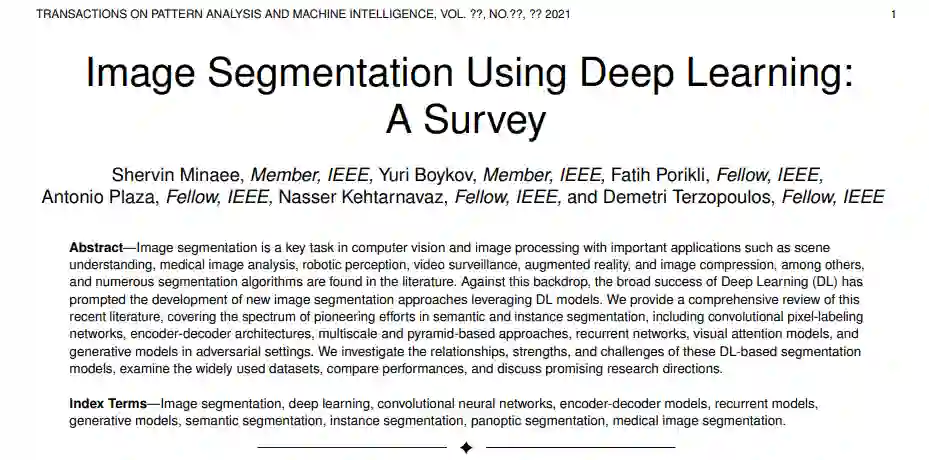 作者:Shervin Minaee, Member, IEEE, Yuri Boykov, Member, IEEE, Fatih Porikli, Fellow, IEEE, Antonio Plaza, Fellow, IEEE, Nasser Kehtarnavaz, Fellow, IEEE, and Demetri Terzopoulos, Fellow, IEEE
