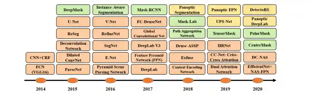 基于深度学习的二维图像分割算法的时间轴。橙色块表示语义块,绿色块表示实例块。