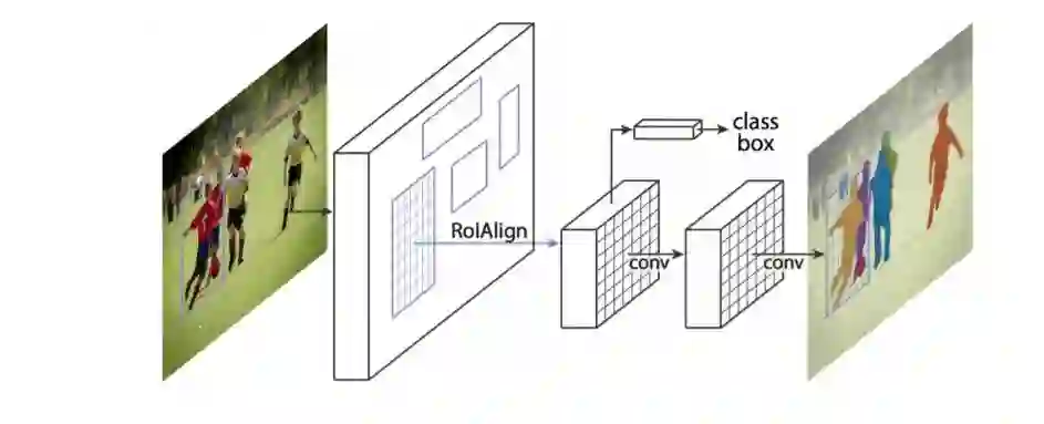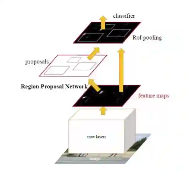 区域卷积网络(R-CNN)及其扩展(Fast R-CNN、Faster R-CNN、Maksed-RCNN)已被证明在对象检测应用中是成功的。R-CNN的一些扩展被大量用于解决实例分割问题;即。的任务,同时执行对象检测和语义分割。特别是,更快的R-CNN[64]体系结构(图16)使用区域建议网络(RPN)提出边界框候选。RPN提取感兴趣区域(RoI), RoIPool层根据这些建议计算特征,以推断边界框坐标和对象的类。