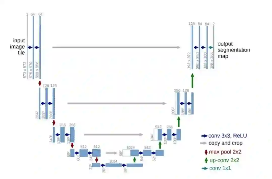 图 12: U-net模型。蓝色方框表示具有指定形状的feature map块。从[50]。