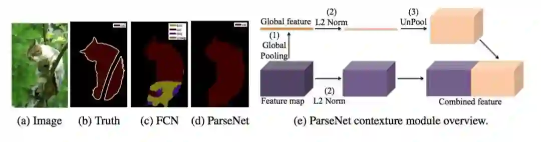 例如,Liu等人提出了一个名为ParseNet的模型,用于解决FCN忽略全局上下文信息的问题。ParseNet通过使用层的平均特性来增加每个位置的特性,从而将全局上下文添加到FCNs中。一个层的特征映射被合并到整个图像上,产生一个上下文向量。这个上下文向量被归一化和未合并,以生成与初始特征图大小相同的新特征图。然后将这些特征映射连接起来。简而言之,ParseNet是一个FCN,所描述的模块替换了卷积层。