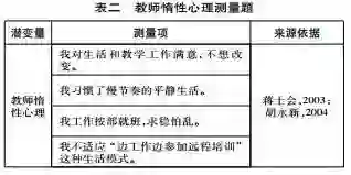 为验证上述假设,本研究查阅与14个潜在因素相关的研究和测量量表,采用已有描述或相应测试题目组合构成了测量工具。教师惰性心理方面,蒋士会(2003)认为有惰性心理的教师墨守成规、习惯于规则,按部就班,存在不敢冒风险、求稳怕乱的思想。胡永新(2004)认为教师惰性心理表现为习惯于慢节奏的平静生活,思想趋向保守僵化,凡事贪图省力,得过且过,应付了事,缺乏进取意识和创新精神。根据他们对教师惰性心理产生的原因以及惰性心理表现行为的描述,本研究设计教师惰性的测量题(见表二)。
