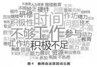 在开展数据测量和分析的同时,研究团队通过在线协作工具Padlet发布了以“您觉得远程培训中引发参训教师阻抗的因素有哪些”为主题的在线同步实时讨论,40位远程参训辅导教师参与讨论。教师们陈述引发阻抗的因素,以文字形式匿名发布在网上白板墙中。研究者将陈述内容整理后形成文字云(见图4)。可见,被提及最多的阻抗产生原因是时间和工作。