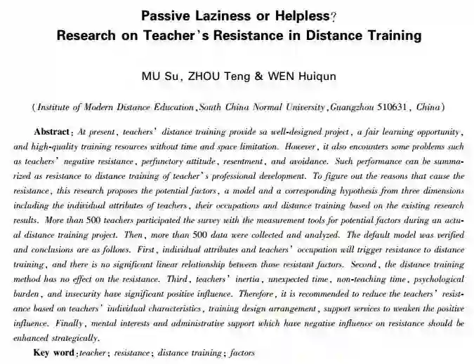 关键词:教师;阻抗;远程培训;产生因素