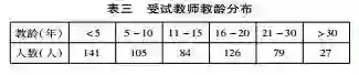 经过调整后的测试题于2016年12月14日至2017年1月20日期间,随进行中的远程培训项目发放并通过网络在线填答,共回收585份填答反馈。通过测试问卷最快填答所需时间为两分钟,时间少于两分钟的被视为无效数据,筛选后的有效问卷562份,有效率96%。参与在线填答的男教师164名,女教师398名;执教学科有语文、数学、英语和其他四类;工龄30年及以上的教师27名,其他教龄段教师人数都在79名以上,5年教龄以下的新教师占总人数的四分之一(见表三)。
