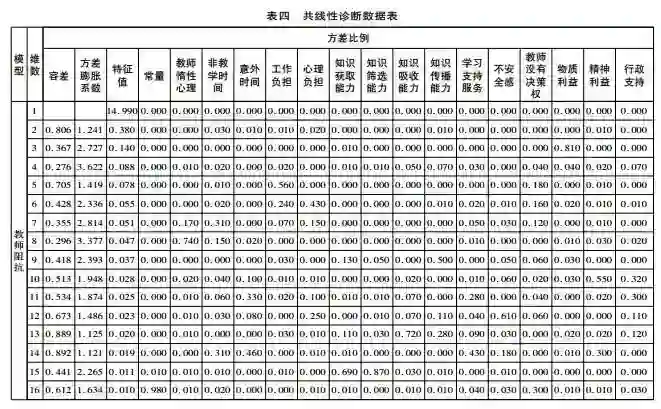 本研究对回收数据进行统计处理,对每个潜在变量对应测试数据多元线性回归中容差(Tolerance)、方差膨胀系数(VIF)、特征值以及方差比例等参数进行判断,所得数据的共线分析结果见表四。