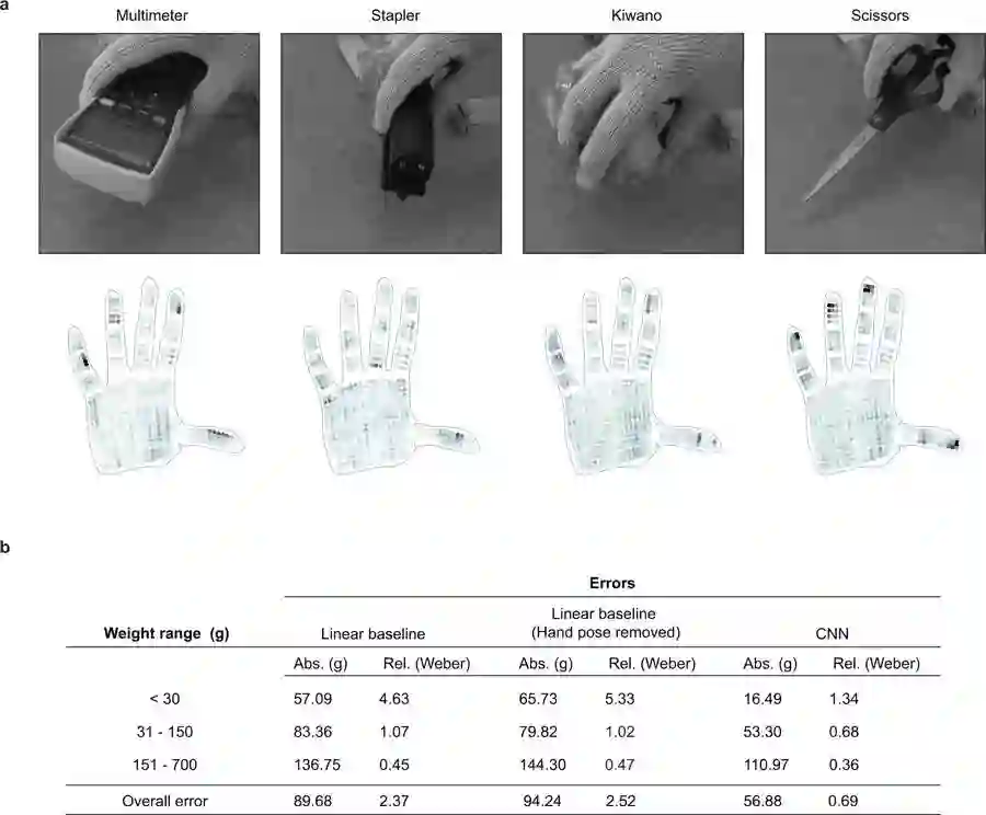 接下来,作者使用手套来拾取物体,并证明了类似的深度学习模型可以估计未知物体的重量。结果显示,重量在60克以内的物体大部分都能准确估计出来。
