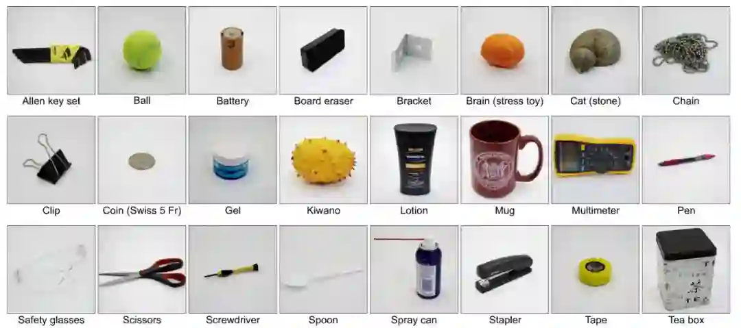 实验总共使用了 26 个物品;这里显示了 24 个,此外还有两个可乐罐(一个空罐和一个满罐)。