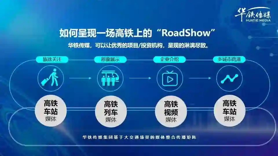 我们结合华铁传媒高铁场景下的各项媒体资源(高铁车站、高铁冠名列车、高铁视频),给大家做个简单展示:一次完整的高铁出行,就是一次完整的路演。