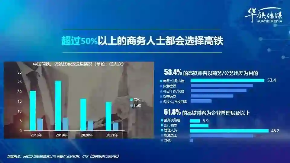 据统计,无论是短途、中途还是长途出差旅行,超过50%以上的商务人士都会选择高铁。在20多亿的高铁客流量中,53.4%的高铁乘客以商务/公务出差为目的,61.8%的高铁乘客为企业管理层及以上。其中最高决策层占比5.9%,部门负责人是10.7%,管理层是45.2%。这部分人群,就是投资机构要找到的优质项目负责人,同时也是优质项目需要找到的投资机构负责人。