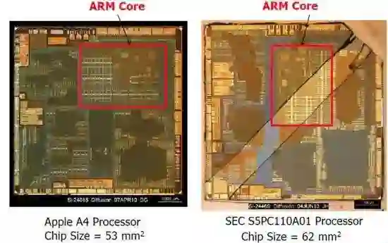 核心显微拍照图的对比显示,苹果 A4 和三星的 S5PC110 差别不大,苹果在后者的基础上去掉了一些接口,并将 L2 缓存 由 512KB 增至 640KB,从而在同等主频之下,性能略胜 S5PC110 一筹。