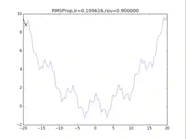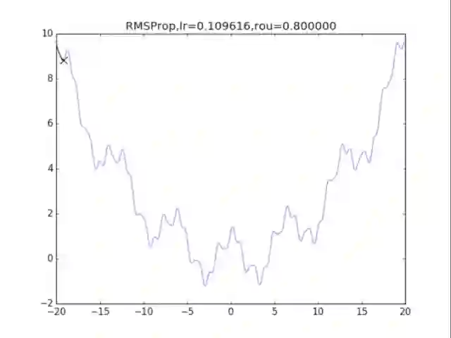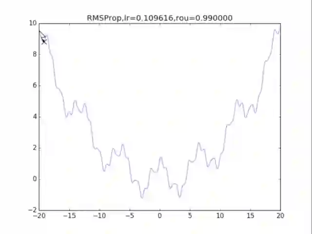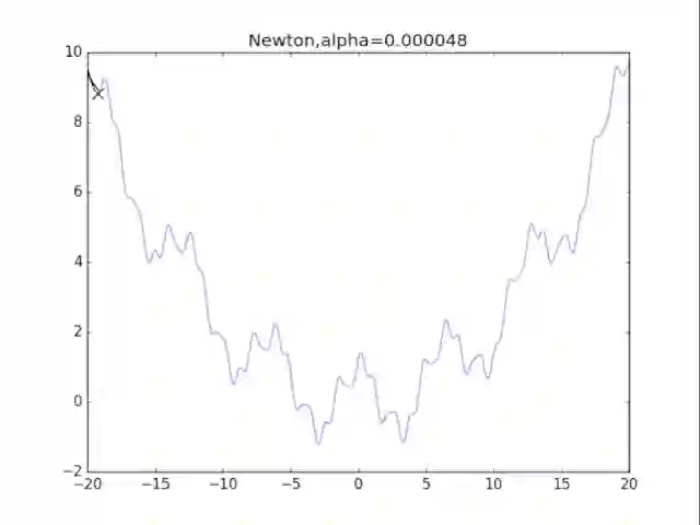 #coding:utf-8from __future__ import print_functionimport numpy as npimport matplotlib.pyplot as pltdef f(x):return (0.15*x)**2 + np.cos(x) + np.sin(3*x)/3 + np.cos(5*x)/5 + np.sin(7*x)/7def df(x):return (9/200)*x - np.sin(x) -np.sin(5*x) + np.cos(3*x) + np.cos(7*x)points_x = np.linspace(-20, 20, 1000)points_y = f(points_x)# 纯粹的梯度下降法,GDfor i in range(10):# 绘制原来的函数plt.plot(points_x, points_y, c="b", alpha=0.5, linestyle="-")# 算法开始lr = pow(2,-i)*16x = -20.0GD_x, GD_y = [], []for it in range(1000):GD_x.append(x), GD_y.append(f(x))dx = df(x)x = x - lr * dxplt.xlim(-20, 20)plt.ylim(-2, 10)plt.plot(GD_x, GD_y, c="r", linestyle="-")plt.title("Gradient descent,lr=%f"%(lr))plt.savefig("Gradient descent,lr=%f"%(lr) + ".png")plt.clf()# 动量 + 梯度下降法for i in range(10):# 绘制原来的函数plt.plot(points_x, points_y, c="b", alpha=0.5, linestyle="-")# 算法开始lr = 0.002m = 1 - pow(0.5,i)x = -20v = 1.0GDM_x, GDM_y = [], []for it in range(1000):GDM_x.append(x), GDM_y.append(f(x))v = m * v - lr * df(x)x = x + vplt.xlim(-20, 20)plt.ylim(-2, 10)plt.plot(GDM_x, GDM_y, c="r", linestyle="-")plt.scatter(GDM_x[-1],GDM_y[-1],90,marker = "x",color="g")plt.title("Gradient descent + momentum,lr=%f,m=%f"%(lr,m))plt.savefig("Gradient descent + momentum,lr=%f,m=%f"%(lr,m) + ".png")plt.clf()# AdaGradfor i in range(15):# 绘制原来的函数plt.plot(points_x, points_y, c="b", alpha=0.5, linestyle="-")# 算法开始lr = pow(1.5,-i)*32delta = 1e-7x = -20r = 0AdaGrad_x, AdaGrad_y = [], []for it in range(1000):AdaGrad_x.append(x), AdaGrad_y.append(f(x))g = df(x)r = r + g*g # 积累平方梯度x = x - lr /(delta + np.sqrt(r)) * gplt.xlim(-20, 20)plt.ylim(-2, 10)plt.plot(AdaGrad_x, AdaGrad_y, c="r", linestyle="-")plt.scatter(AdaGrad_x[-1],AdaGrad_y[-1],90,marker = "x",color="g")plt.title("AdaGrad,lr=%f"%(lr))plt.savefig("AdaGrad,lr=%f"%(lr) + ".png")plt.clf()# RMSPropfor i in range(15):# 绘制原来的函数plt.plot(points_x, points_y, c="b", alpha=0.5, linestyle="-")# 算法开始lr = pow(1.5,-i)*32delta = 1e-6rou = 0.8x = -20r = 0RMSProp_x, RMSProp_y = [], []for it in range(1000):RMSProp_x.append(x), RMSProp_y.append(f(x))g = df(x)r = rou * r + (1-rou)*g*g # 积累平方梯度x = x - lr /(delta + np.sqrt(r)) * gplt.xlim(-20, 20)plt.ylim(-2, 10)plt.plot(RMSProp_x, RMSProp_y, c="r", linestyle="-")plt.scatter(RMSProp_x[-1],RMSProp_y[-1],90,marker = "x",color="g")plt.title("RMSProp,lr=%f,rou=%f"%(lr,rou))plt.savefig("RMSProp,lr=%f,rou=%f"%(lr,rou) + ".png")plt.clf()# Adamfor i in range(48):# 绘制原来的函数plt.plot(points_x, points_y, c="b", alpha=0.5, linestyle="-")# 算法开始lr = pow(1.2,-i)*2rou1,rou2 = 0.9,0.9 # 原来的算法中rou2=0.999,但是效果很差delta = 1e-8x = -20s,r = 0,0t = 0Adam_x, Adam_y = [], []for it in range(1000):Adam_x.append(x), Adam_y.append(f(x))t += 1g = df(x)s = rou1 * s + (1 - rou1)*gr = rou2 * r + (1 - rou2)*g*g # 积累平方梯度s = s/(1-pow(rou1,t))r = r/(1-pow(rou2,t))x = x - lr /(delta + np.sqrt(r)) * splt.xlim(-20, 20)plt.ylim(-2, 10)plt.plot(Adam_x, Adam_y, c="r", linestyle="-")plt.scatter(Adam_x[-1],Adam_y[-1],90,marker = "x",color="g")plt.title("Adam,lr=%f"%(lr))plt.savefig("Adam,lr=%f"%(lr) + ".png")plt.clf()# 牛顿法for i in range(72):# 绘制原来的函数plt.plot(points_x, points_y, c="b", alpha=0.5, linestyle="-")# 算法开始alpha= pow(1.2,-i)*20x = -20.0Newton_x, Newton_y = [], []for it in range(1000):Newton_x.append(x), Newton_y.append(f(x))g = df(x)gg = ddf(x)x = x - g/(gg+alpha)plt.xlim(-20, 20)plt.ylim(-2, 10)plt.plot(Newton_x, Newton_y, c="r", linestyle="-")plt.scatter(Newton_x[-1],Newton_y[-1],90,marker = "x",color="g")plt.title("Newton,alpha=%f"%(alpha))plt.savefig("Newton,alpha=%f"%(alpha) + ".png")plt.clf()