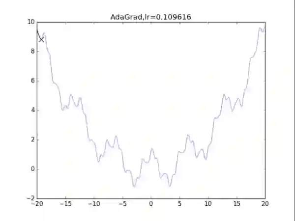 给出学习率lr,delta=1e-7累计梯度r=0,初始xwhile True:g = df/dxr = r + g*gx = x - lr / (delta+ sqrt(r)) * g