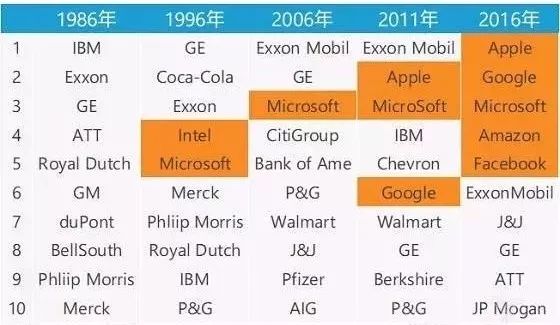 如果我们回顾过去几十年美国标普成分股大企业的变化历史,会发现在不同时代,代表性大企业是不一样的,工业(GE,GM),能源(Royal Dutch,Exxon),消费(Coca-Cola, P&G),金融(CitiGroup, Bank of America)都曾经是每个时代的代表性企业。