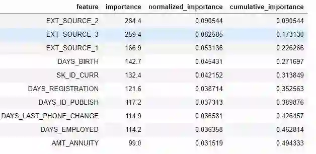FeatureSelector 能使用来自 LightGBM 库的梯度提升机来得到特征重要度。为了降低方差,所得到的特征重要度是在 GBM 的 10 轮训练上的平均。另外,该模型还使用早停(early stopping)进行训练(也可关闭该选项),以防止在训练数据上过拟合。