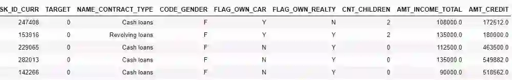 为了进行演示,我们将使用来自 Kaggle「家庭信用违约风险」机器学习竞赛的一个数据样本。了解该竞赛可参阅:https://towardsdatascience.com/machine-learning-kaggle-competition-part-one-getting-started-32fb9ff47426,完整数据集可在这里下载:https://www.kaggle.com/c/home-credit-default-risk/data。这里我们将使用部分数据样本来进行演示。