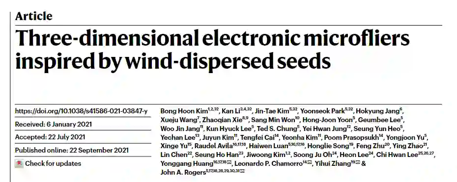 受风传播种子的启发,美国西北大学John A.Rogers 院士、黄永刚院士和清华大学张一慧教授带领的国际合作团队报道了一种屈曲力学组装的新型三维微电子飞行器,以实现在空气中被动、长时间、远距离飞行。这篇文章以封面形式发表在了Nature 上。