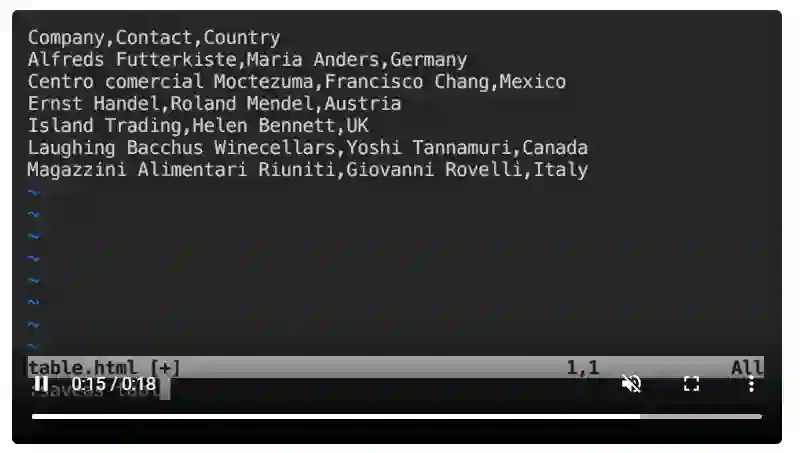 Vim 的宏是它最好的特性之一,在下面这个示例中,我们使用嵌套的 Vim 宏快速地将 html 表格转换成了 csv 格式。