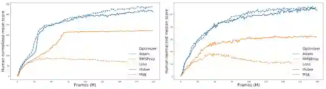 此外,在比较各种「优化器 - 损失函数」组合的过程中,研究者发现当使用 RMSProp 时,Huber 损失往往比 MSE 表现得更好(实线和橙色虚线之间的间隙可以说明这一点)。