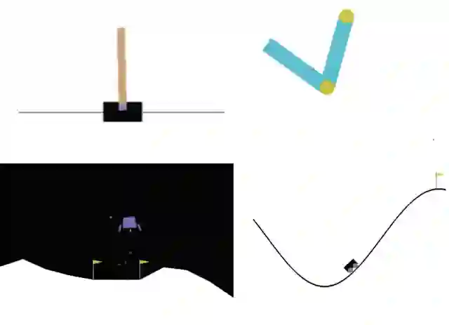 左上:在 CartPole 中,游戏任务是智能体通过左右移动平衡推车上的一根杆子;右上:在 Acrobot 中,有两个杠杆和两个连接点,智能体需要向两个杠杆之间的连接点施加力以抬高下面的杠杆使其高于某个高度要求。左下:在 LunarLander 中,智能体的任务是将飞船降落在两个旗帜之间;右下:在 MountainCar 中,智能体需要在两座山丘之间借助一定的动力将车开到右边的山顶。