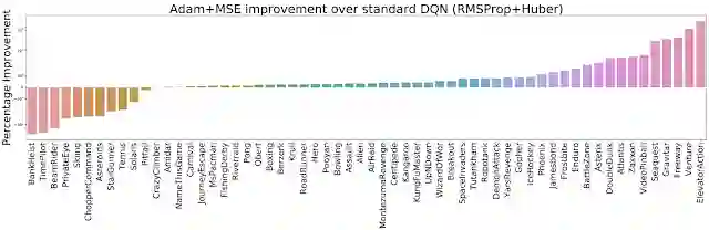 因此,研究者将两个优化器(RMSProp、Adam 优化器)与两个损失函数(Huber、MSE 损失)进行了不同的组合,并在整个 ALE 平台(包含 60 款 Atari 2600 游戏)上进行了评估。结果发现 Adam+MSE 组合优于 RMSProp+Huber 组合。
