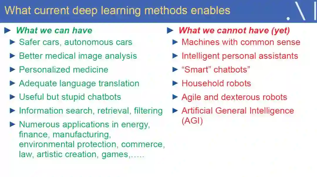 【导读】Yann LeCun 近日在哈佛大学脑神经与行为科学讲坛发表演说,前瞻性地指出现如今深度学习的能力及其局限性。报告首先回顾了深度学习发展的里程和现如今发挥巨大作用的原因,并指出各种深度学习模型(比如强化学习)的局限性和它们无法解决的问题。这些局限性同时也是对未来研究方向的指引,值得参考。