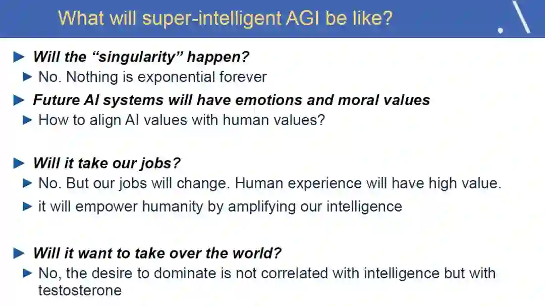 最后,讨论了超智能AGI的情况,以及对应人们比较关心的问题,比如“奇点”会发生吗?未来的人工智能系统是否将拥有情感和道德价值?它会抢走我们的工作吗?它想要统治世界吗?等等