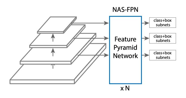 当前目标检测网络中采用特征金字塔网络(FPN)结构解决多尺度的问题,但是这些 FPN 都是人工事先设计,并不一定是最优的结构。为了更灵活地获得更优的 FPN 结构,该文章首创性地提出了采用神经架构搜索(NAS)的方式定制化地构建 FPN,该结构又称 NAS-FPN。