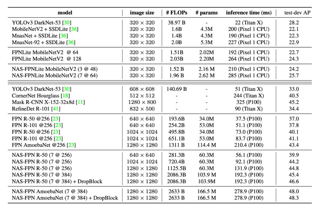 本文提出利用神经架构搜索进一步优化用于目标检测的特征金字塔网络的设计过程。在 COCO 数据集上的实验表明,神经结构搜索发现的架构,名为 NAS-FPN,具有良好的灵活性和高性能,可用于构建精确的检测模型。在广泛的精度和速度权衡方面,NAS-FPN 在许多检测任务的主干架构上产生了显著改进。