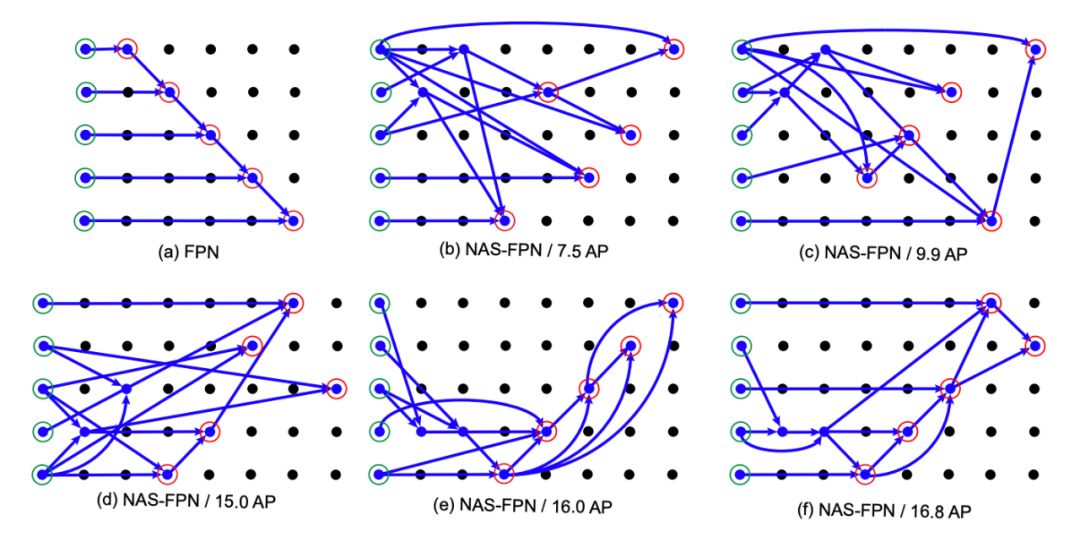 其搜索得到的最优 FPN 结构如下图,其控制器收敛得到的最终 FPN 结构如 (f) 所示,并且其精度最高。从中可得训练时间越长其轨迹越曲折混乱:其搜索得到的最优 FPN 结构如下图,其控制器收敛得到的最终 FPN 结构如 (f) 所示,并且其精度最高。从中可得训练时间越长其轨迹越曲折混乱: