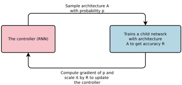 NAS 利用强化学习训练控制器在给定的搜索空间中选择最优的模型架构。控制器利用子模型在搜索空间中的准确度作为奖励信号来更新参数。因此,通过反复试验,控制器逐渐学会了如何生成更好的架构。由于不知道 FPN 的跨连接情况,NAS-FPN 采用 RNN 作为控制器,使用该控制器来产生一串信息,用于构建不同的连接。其宏观结构如下图所示: