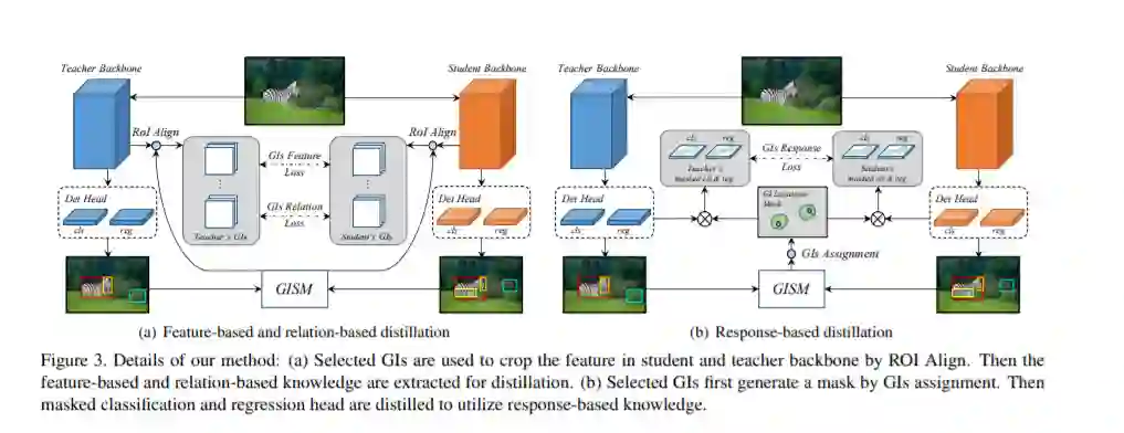 GID提出了一种基于检测任务的新型蒸馏方法。通过从teacher和studnet中分别提取general instance (GI),并提出GISM模块自适应选择差异大的instance进行feature-based、relation-based以及response-based蒸馏。本方法首次将关系型知识蒸馏应用于检测框架,且将蒸馏目标从独立考虑的正负样本蒸馏统一为更本质GI蒸馏,过程中不依赖于GT,且达到SOTA。