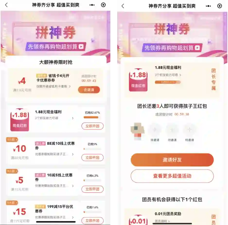 孩子王在微信小程序内设置了「拼神券」活动页面,用户可以通过邀请好友拼团获得相应优惠券。