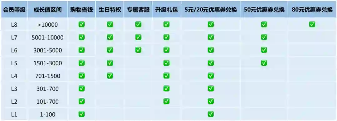 目前孩子王的成长型会员共分为8个等级:L1-L8,各等级的成长值要求如下: