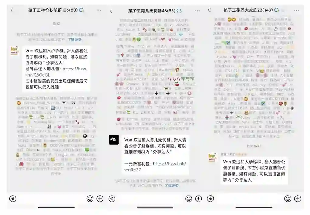 另外,在孩子王引以为傲的私域端,用户分层的思维也值得很多商家学习。孩子王在邀请用户入群这个环节,增加一个十分有意思的动作,同时给了用户3个群:特价秒杀群、育儿无忧群、孕妈大家庭。