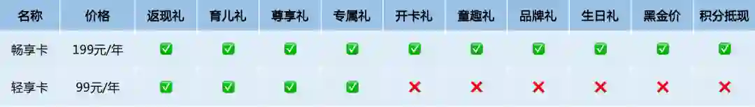 199元/年的畅享卡则瞄准的是婴幼童人群,在轻享卡的基础上,增加了6项权益,主要以消费需求为主,突出两个特点:
