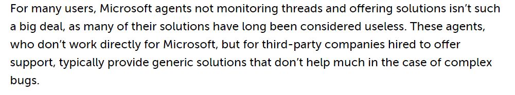 另外,目前有观点认为微软不再提供技术支持其实也不是什么大问题,因为在论坛上,技术支持其实是由微软代理方提供的,这些技术支持代理不是直接为微软工作,而是微软雇佣的第三方公司提供的,他们通常只是给出相应问题的通用解决方案,对于稍微复杂一些的用户提问没有多大帮助。