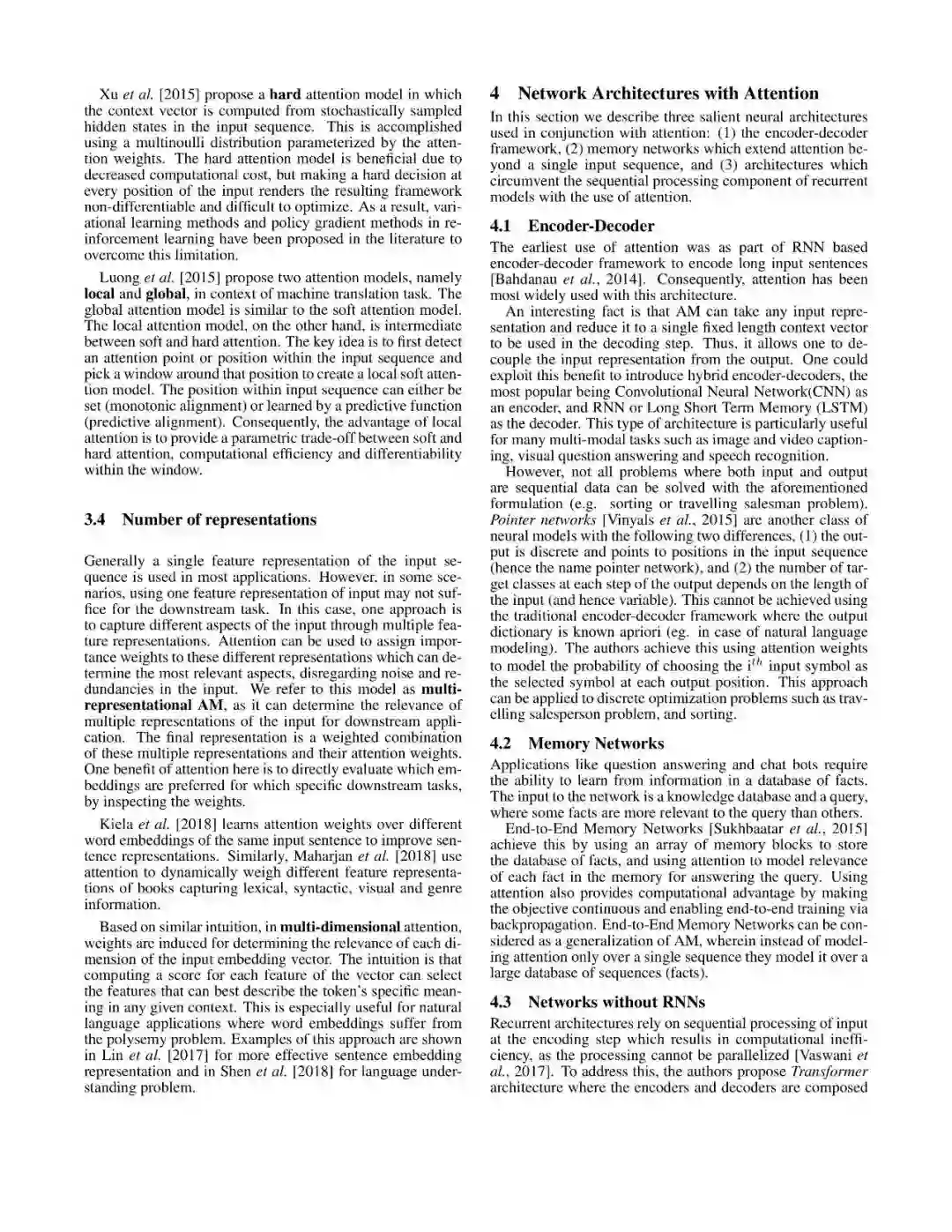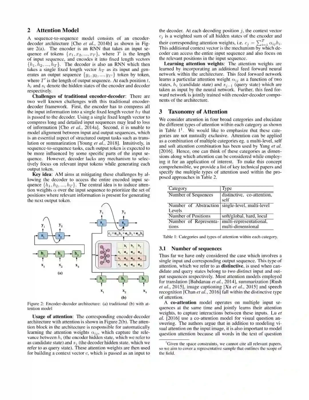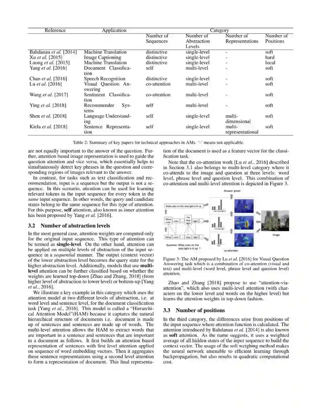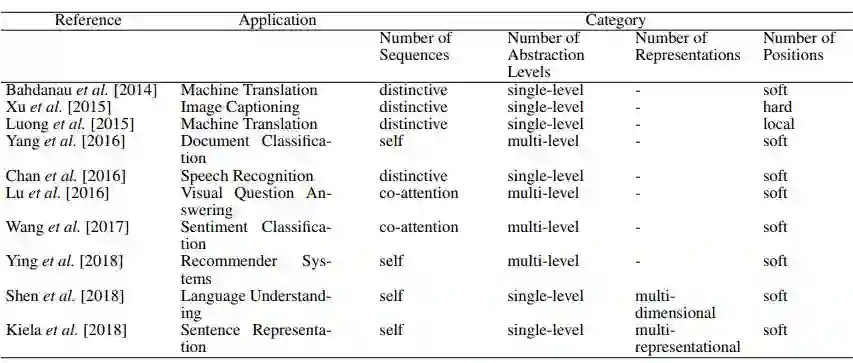 文章从Number of Sequences、Number of Abstraction Levels、Number of Positions、Number of Representations等多个维度对注意力模型进行了分类,具体结果如下: